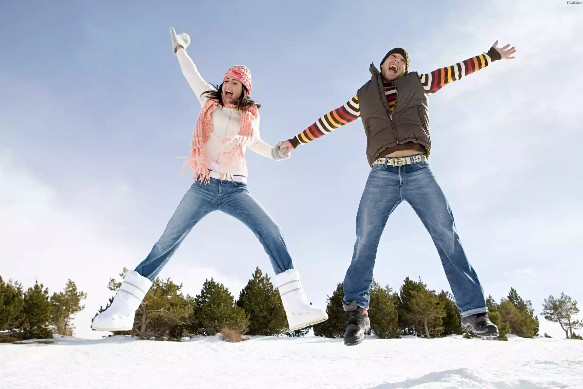 Para, Zima, Niebo, Radość, Śnieg, Drzewa - faceci.biz